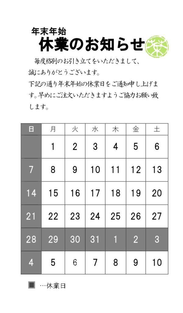 2025年12月営業日のご案内